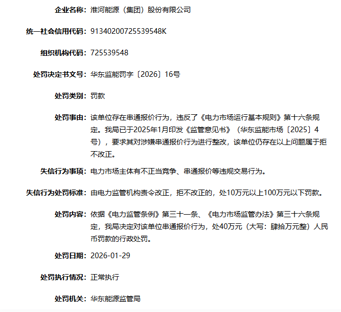 近日,国家能源局资质和信用信息系统处罚信息显示,淮河能源(集团)股份有限公司因存在串通报价行为,违反了《电力市场运行基本规则》第十六条规定,责令对涉嫌串通报价行为进行整改,但仍存在以上问题属拒不改正。被华东能源监管局罚款40万元。