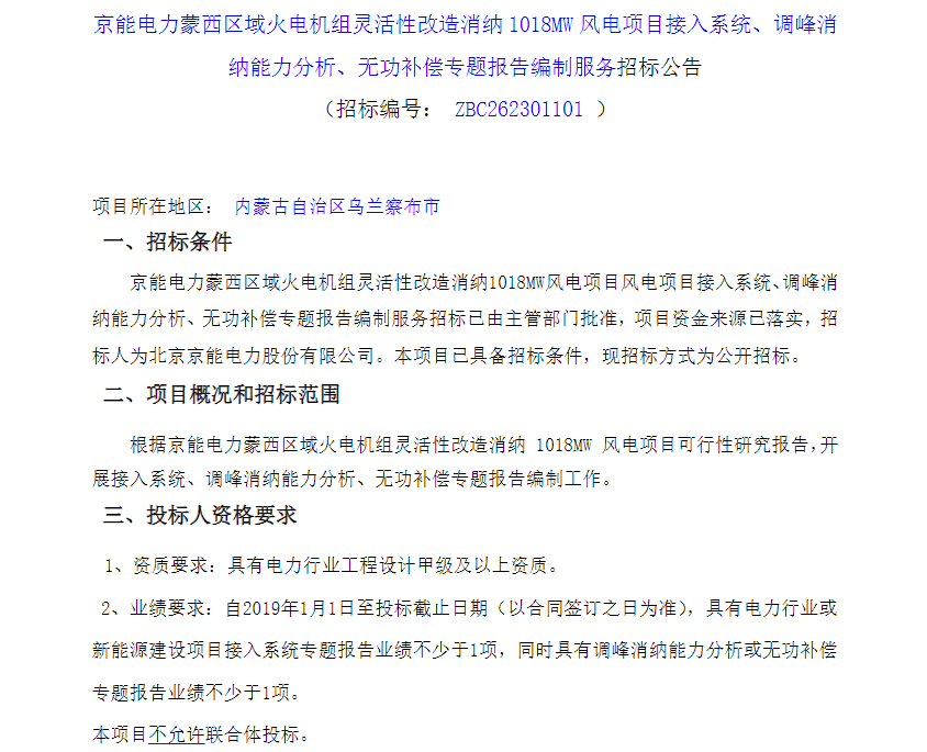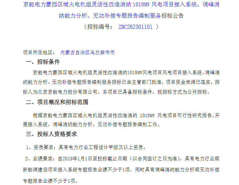 京能电力蒙西区域火电机组灵活性改造消纳1018MW风电项目接入系统、调峰消纳能力分析、无功补偿专题报告编制服务招标公告