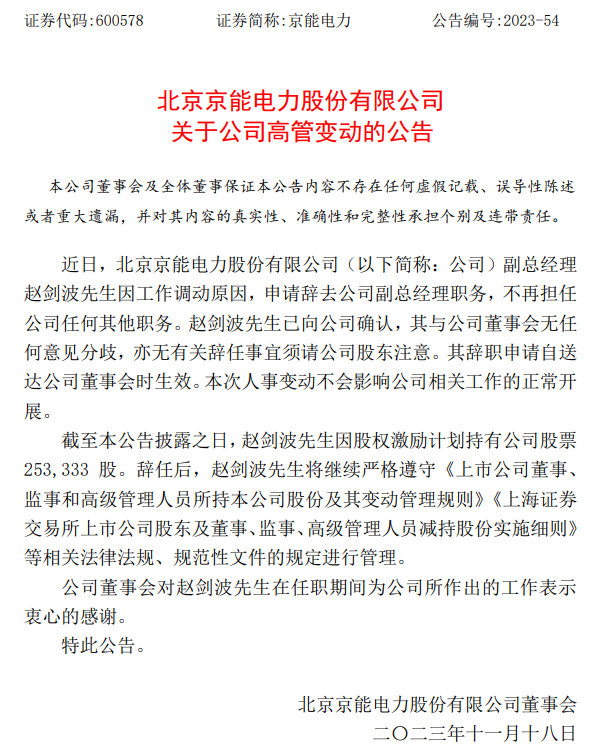 公告称,近日,京能电力副总经理赵剑波先生因工作调动原因,申请辞去公司副总经理职务,不再担任公司任何其他职务。