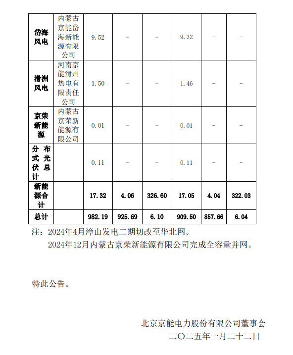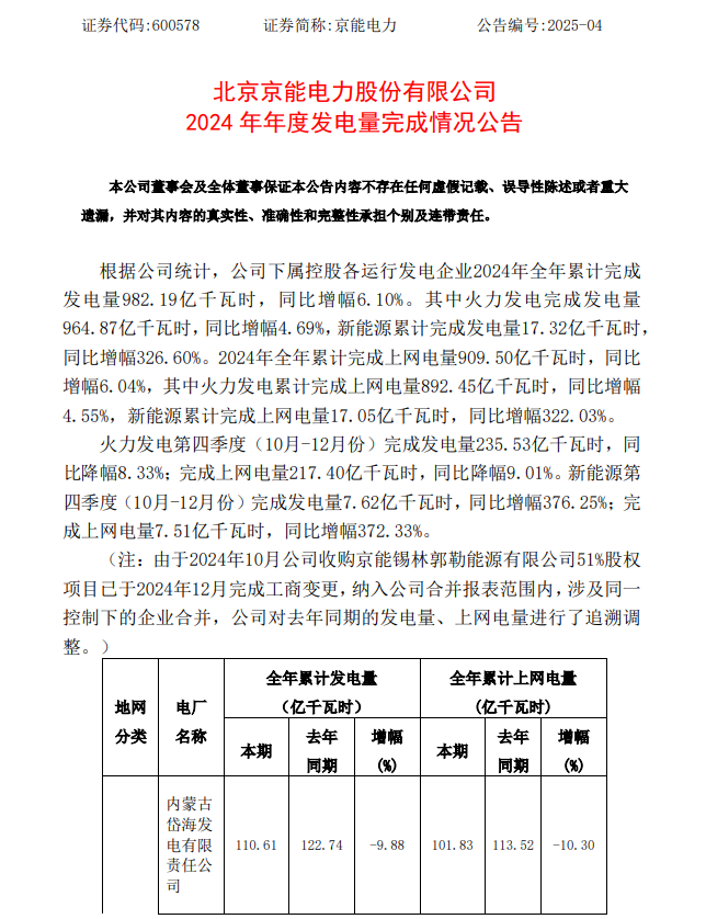 1月22日,京能电力发布2024年年度发电量完成情况公告