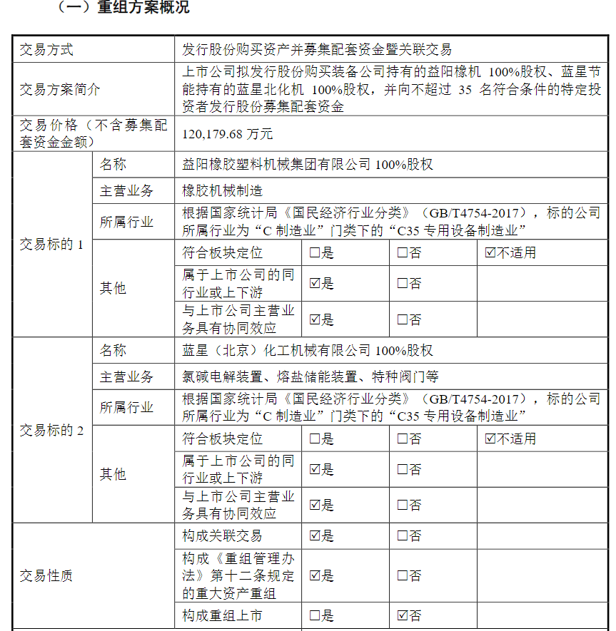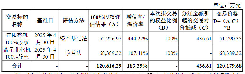 公告显示,本次交易中,上市公司聘请天健兴业以2025年4月30日为评估基准日对标的资产进行了评估,其中益阳橡机100%股权评估值为52,226.97万元,蓝星北化机100%股权评估值为68,389.32万元。基于前述评估值,扣减标的公司控股子公司评估基准日后减资分红导致的影响,并经交易各方充分协商后,益阳橡机100%股权交易对价为51,790.35万元,其中以发行股份的方式支付对价51,790.35万元;蓝星北化机100%股权交易对价为68,389.32万元,其中以发行股份的方式支付对价68,389.32万元。