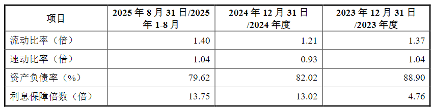 2023年末、2024年末以及2025年8月31日,益阳橡机的资产负债率分别为88.90%、82.02%和79.62%。