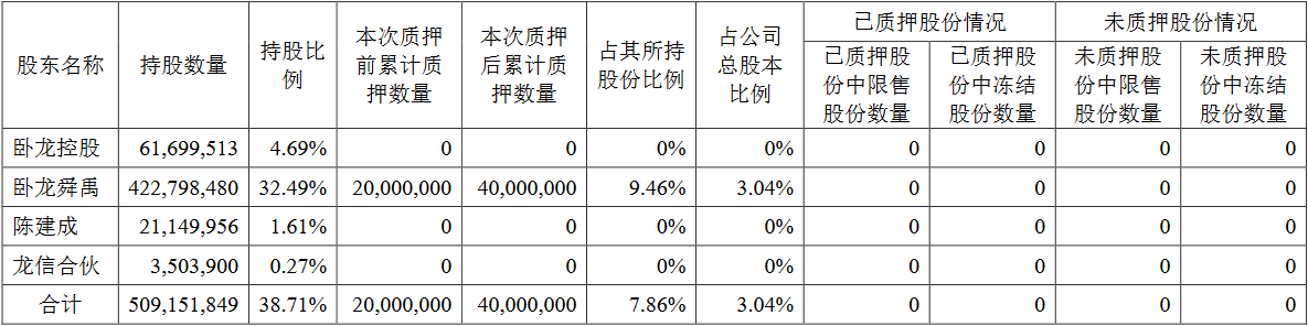 卧龙舜禹持有卧龙电驱股份4.23亿股,占公司总股本的32.15%,为公司第一大股东。本次质押前,卧龙舜禹质押公司股份2000.00万股,占其持有公司股份总数的4.73%,占公司总股本的1.52%;本次质押后,卧龙舜禹累计质押公司股份4000.00万股,占其持有公司股份总数的9.46%,占公司总股本的3.04%。