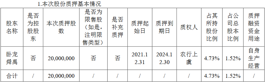 中国经济网北京1月11日讯卧龙电驱(600580.SH)昨日晚间发布公告称,公司于昨日接到第一大股东浙江卧龙舜禹投资有限公司(以下简称“卧龙舜禹”)的通知,获悉其所持有公司的部分股份被质押,本次质押股数为2000.00万股,占其所持股份比例为4.73%,占公司总股本比例为1.52%,于2022年1月7日质押给中国农业银行股份有限公司绍兴上虞支行(以下简称“农行上虞”)。