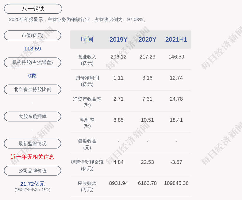 2020年年报显示,八一钢铁的主营业务为钢铁行业,占营收比例为:97.03%。