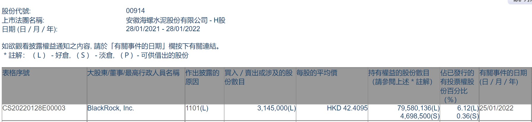 香港联交所最新资料显示,1月25日,贝莱德增持海螺水泥(00914)314.5万股,每股作价42.4095港元,总金额约为1.33亿港元。增持后最新持股数目约为7958.01万股,最新持股比例为6.12%。