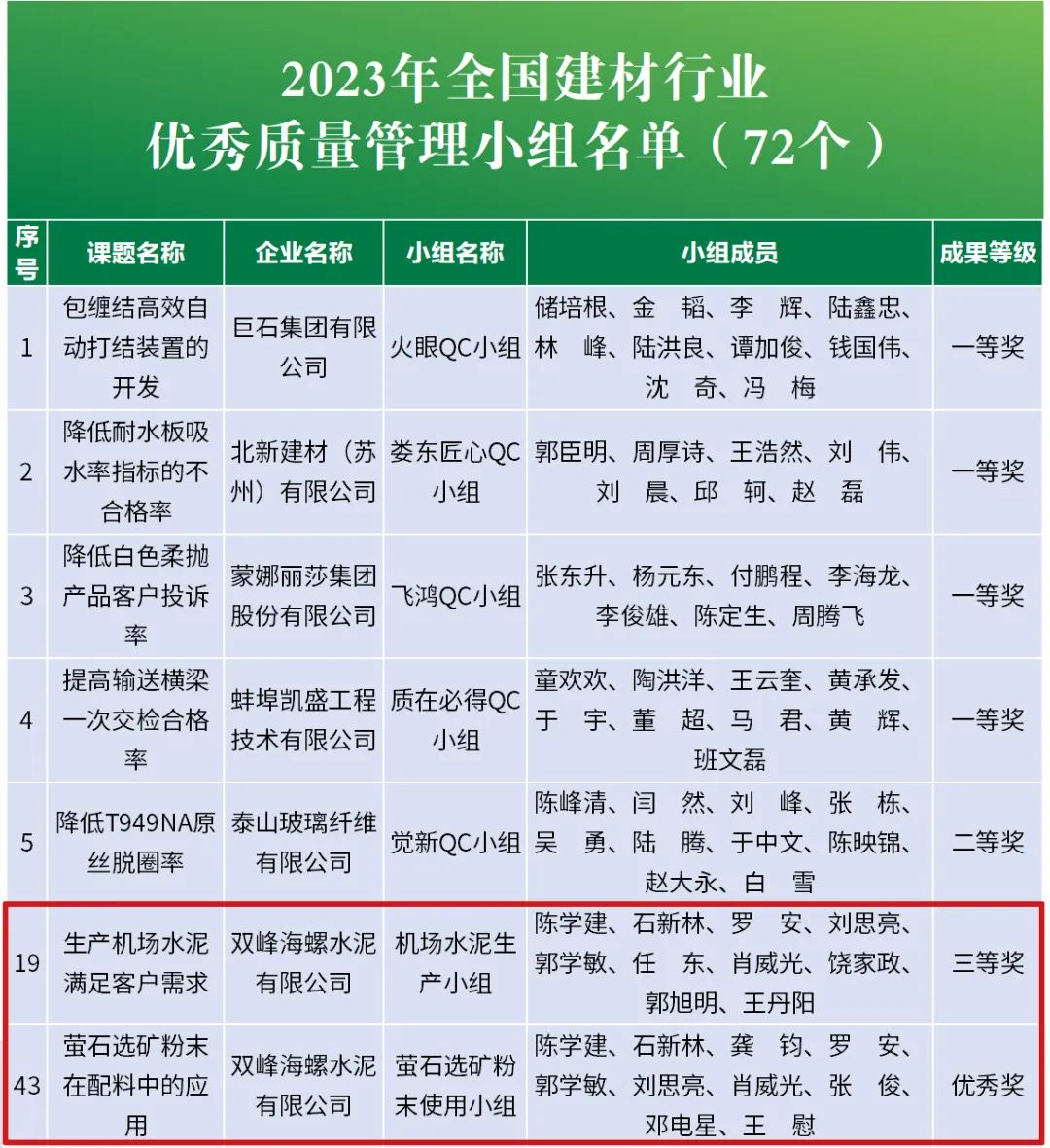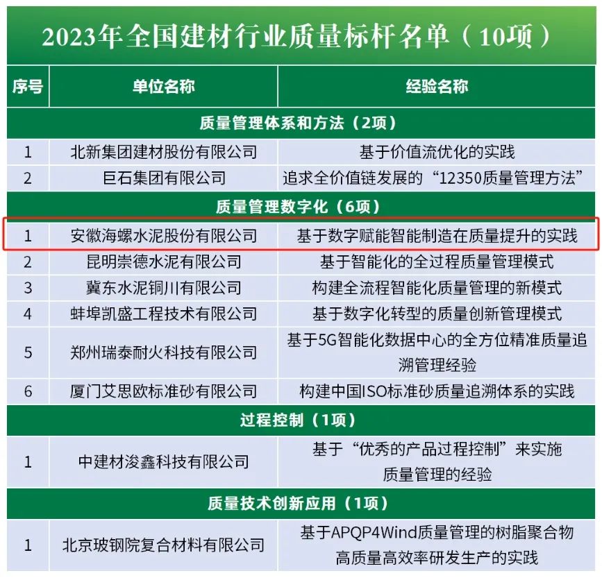 近日,中国建筑材料联合会公布2023年全国建材行业质量标杆名单,海螺水泥“基于数字赋能智能制造在质量提升的实践”案例入选2023年全国建材行业质量标杆名单(质量管理数字化)。在联合会组织开展的2023年全国建材行业质量管理活动中,双峰海螺水泥有限公司机场水泥生产小组和萤石选矿粉末使用小组入选2023年全国建材行业优秀质量管理小组名单。