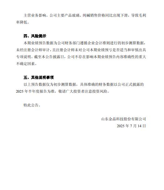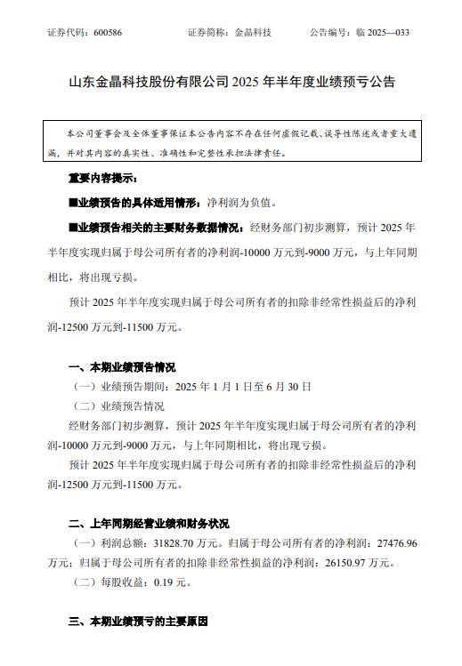 国内玻璃制造龙头企业山东金晶科技(600586.SH)近日发布2025年半年度业绩预告,预计归属于母公司股东的净利润将亏损9000万元至1亿元,与去年同期2.75亿元的净利润相比出现断崖式下跌。扣除非经常性损益后,亏损进一步扩大至1.15亿至1.25亿元。
