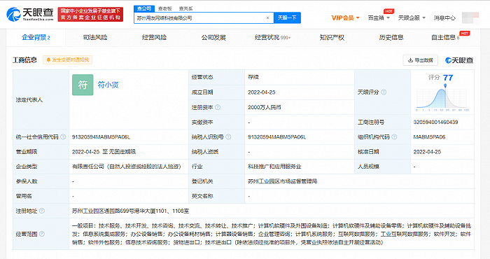 4月25日,苏州用友网络科技有限公司成立,法定代表人为符小贤,注册资本2000万元。经营范围包括计算机软硬件及外围设备制造;信息系统集成服务;办公设备销售;互联网数据服务;工业互联网数据服务等。股东信息显示,该公司由用友网络科技股份有限公司全资控股。