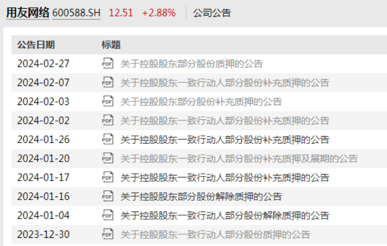 进入2024年来,用友网络已经发布约9条有关股份质押的相关公告,其中2条为解除质押,其余7条均为质押或补充质押。