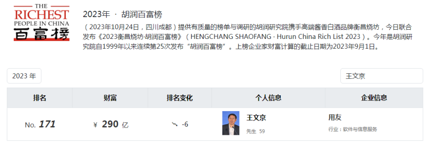 据2023年胡润百富榜,王文京以290亿的财富排名127位。据媒体报道,2015年,王文京曾以29亿美元的财富位列《福布斯》华人富豪榜第103位,成为江西首富。