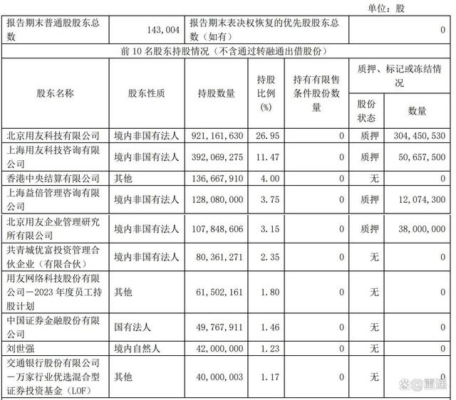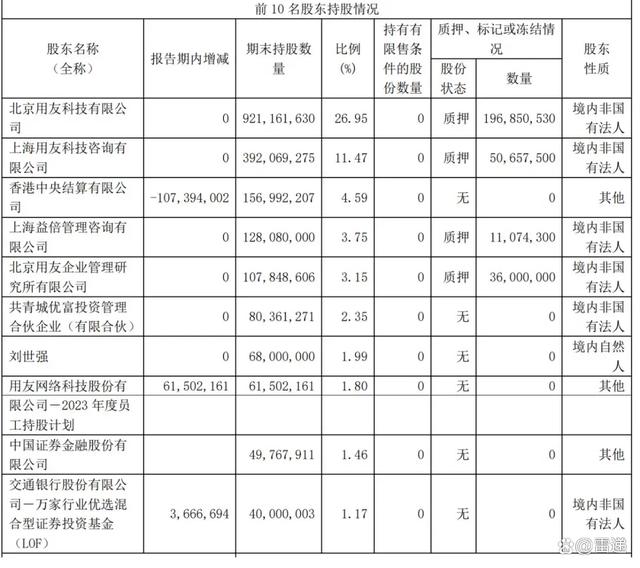 截至2024年3月31日,北京用友科技有限公司持股26.95%,上海用友科技咨询有限公司持股11.47%,香港中央结算有限公司持股4%,上海益倍管理咨询有限公司持股为3.75%;