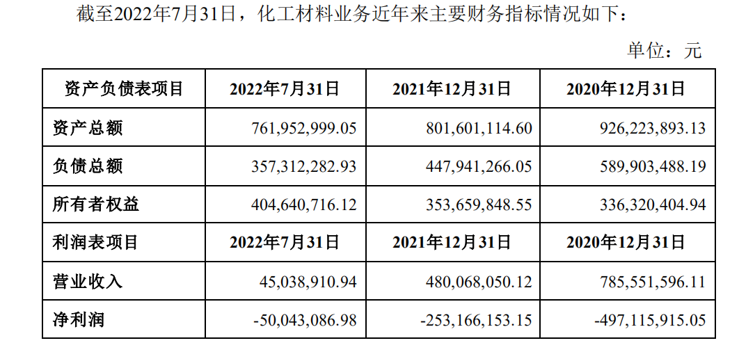 自2020年以来,广东榕泰化工材料业务资产总额、营业收入连续下滑,而且化工材料业务在2020年度、2021年度及2022年1~7月利润均为亏损状态,对上市公司的整体经营发展造成较大拖累。
