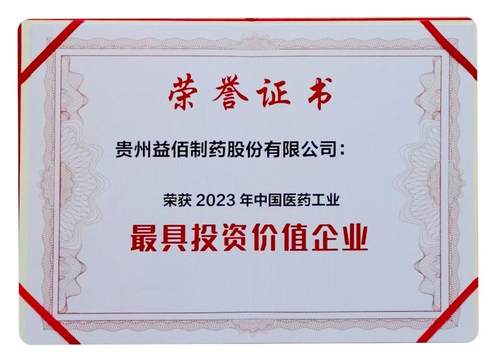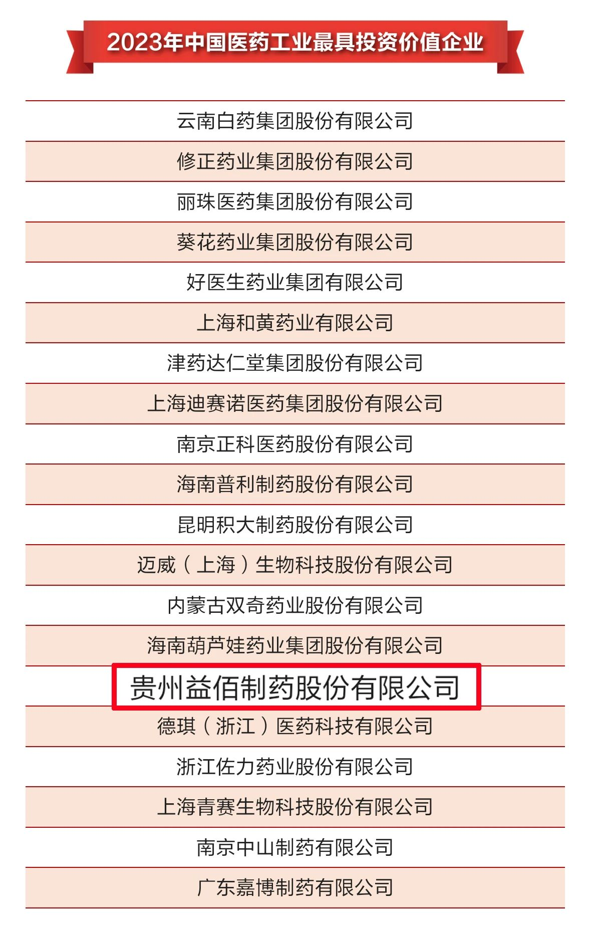 11月18日,“2023年中国医药工业最具投资价值企业”榜单在第40届全国医药工业信息年会暨2022年度中国医药工业百强论坛上隆重揭晓。贵州益佰制药股份有限公司(股票简称:益佰制药,股票代码:600594)榜上有名。