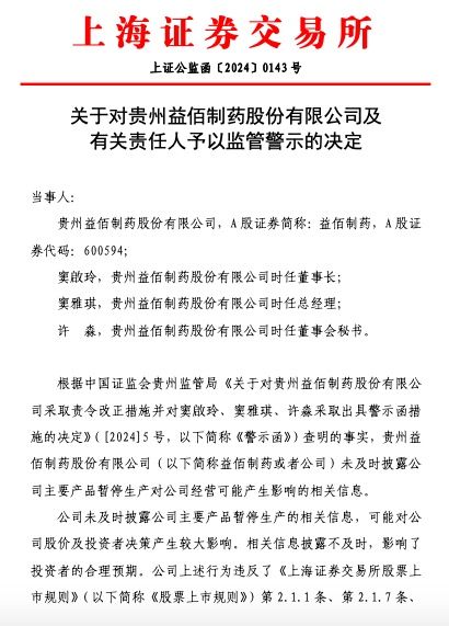 上交所公告称,根据中国证监会贵州监管局《关于对贵州益佰制药股份有限公司采取责令改正措施并对窦啟玲、窦雅琪、许淼采取出具警示函措施的决定》([2024]5号,以下简称《警示函》)查明的事实,益佰制药未及时披露公司主要产品暂停生产对公司经营可能产生影响的相关信息。