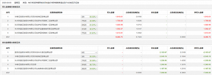 具体来看,国信证券深圳龙华大道证券营业部、华泰证券深圳前海证券营业部分别卖出2105.67万元、2049.19万元;华泰证券深圳前海证券营业部、东方财富证券拉萨东环路第二证券营业部分别买入1915.61万元、1739.08万元。