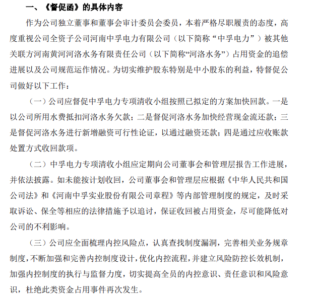 《督促函》显示,作为公司独立董事和董事会审计委员会委员,本着严格尽职履责的态度,高度重视公司全资子公司河南中孚电力有限公司(简称“中孚电力”)被其他关联方河南黄河河洛水务有限责任公司(简称“河洛水务”)占用资金的追偿进展以及公司规范运作情况。