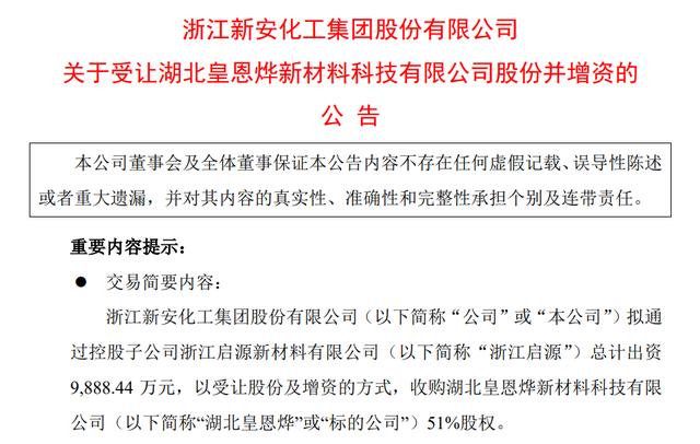 10月10日晚,新安股份发布公告,拟作价9,888.44万元,收购湖北皇恩烨51%的股权。标的公司专业从事石墨化和负极材料生产,现拥有2万吨/年石墨化产能以及8,000吨/年人造石墨负极成品装置。