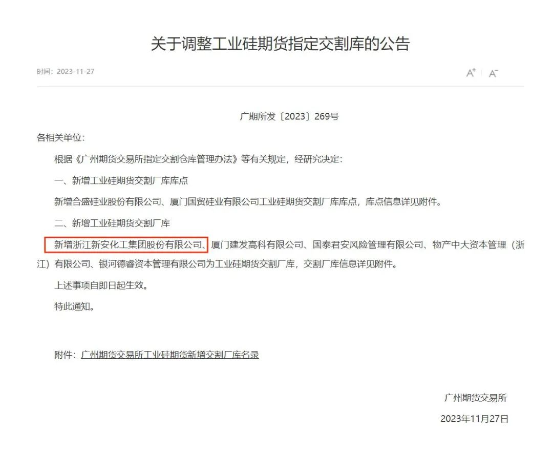 全球有机硅网12月7日讯:近日,广州期货交易所(以下简称“广期所”)发布《关于调整工业硅期货指定交割库的公告》,新安股份成功获批工业硅期货生产厂基准交割厂库资质。