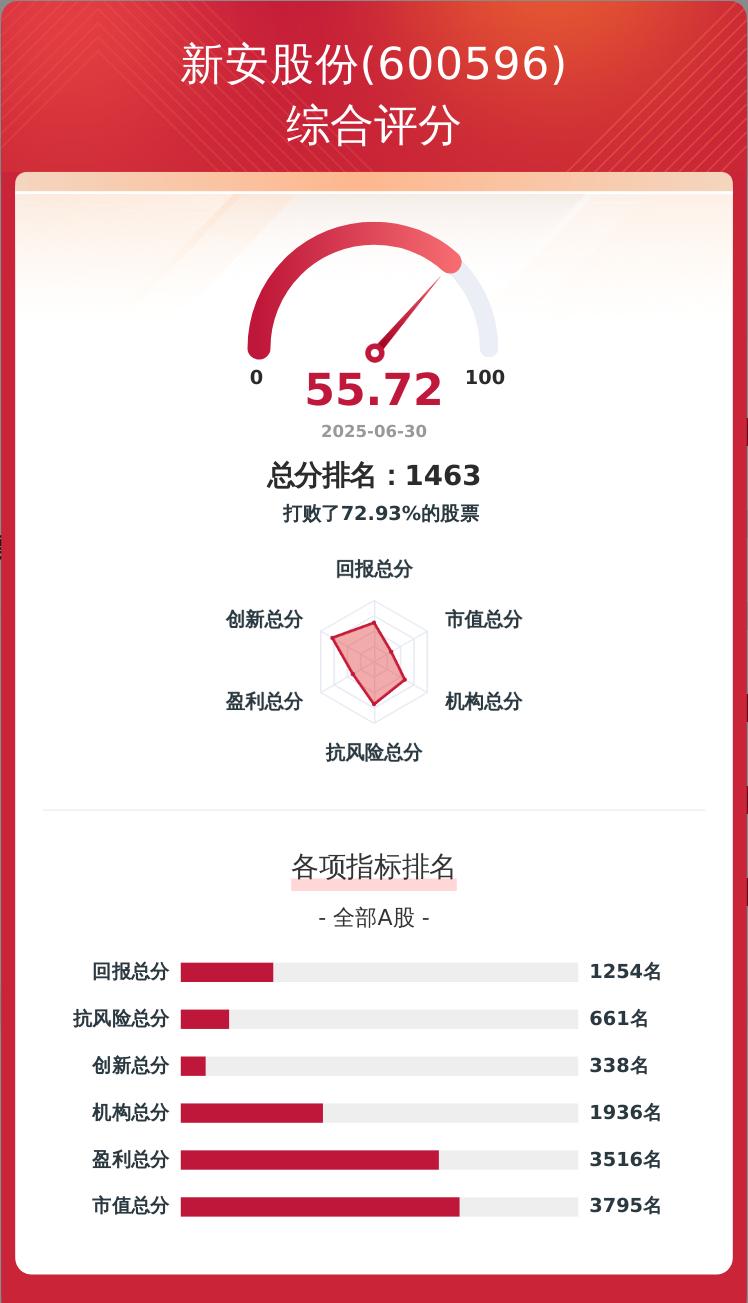 新安股份在不同评估维度上的表现各有差异,其中创新维度得分最高,为78.32分(折合10.96分),显示出公司在研发和创新能力方面的优势;而盈利维度得分最低,仅为39.69分(折合7.94分)。其他方面如回报、抗风险、机构以及市值维度得分分别为63.66分(10.19分)、68.92分(11.03分)、57.93分(10.43分)及32.36分(5.18分)。这表明新安股份在保持良好创新能力和相对稳定的抗风险能力的同时,在提高盈利能力和发展市值方面还有待加强。