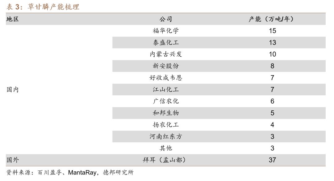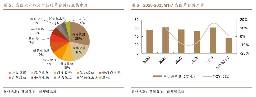 我国供给约束持续提升,新增产能更趋于谨慎。据观研天下,2013年以来,国家不断加大对草甘膦环保监察力度,如2013年发布的《关于开展草甘膦(双甘膦)生产企业环保核查工作的通知》要求,到2015年底前,基本完成对草甘膦行业全面环保核查。此后2015年开始进行4轮高压环保核查、督察以及安全检查,我国草甘膦供给格局大幅优化,产业集中度明显提高。2019年的“三磷”整治则进一步促使草甘膦供给端落后产能逐步出清。根据国家发改委发布的《产业结构调整指导目录(2024年本)》,其将新建草甘膦生产装置列为限制类项目,禁止进行新建项目投资。我们预计未来草甘膦新增产能或有限,行业扩产或以技改为主。据百川盈孚,草甘膦现存新建产能规划仅包括江山股份10万吨/年、兰州鑫隆泰3万吨/年,以及潍坊润丰2.5万吨/年。此外有和邦生物计划在广安建设50万吨/年双甘膦(草甘膦直接原料),在印尼建设20万吨/年草甘膦项目。