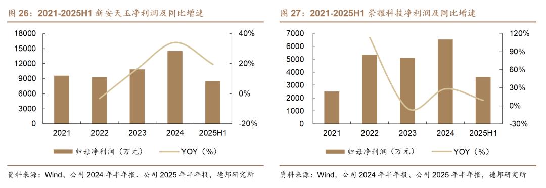 1)新安天玉:新安天玉专注于生产各类混炼硅橡胶、液体硅橡胶产品,集研发、生产、销售、服务为一体的国家高新技术企业,主营涉及135个产品系列、700多个不同产品需求的中高端硅橡胶制品原料,年产能混炼硅橡胶40000吨、液体硅橡胶7000吨,产品销往美国、日本、意大利、巴西、东南亚等40多个国家和地区。其中,高压连接器用硅橡胶、电力附件用硅橡胶、特种电缆胶、动力电池用硅橡胶等中高端产品产销量在行业中名列前茅,居于行业领军地位。2024年,新安天玉实现净利润1.45亿元,同比+33.95%,2025年上半年实现净利润8460.45万元,同比再+19.47%。