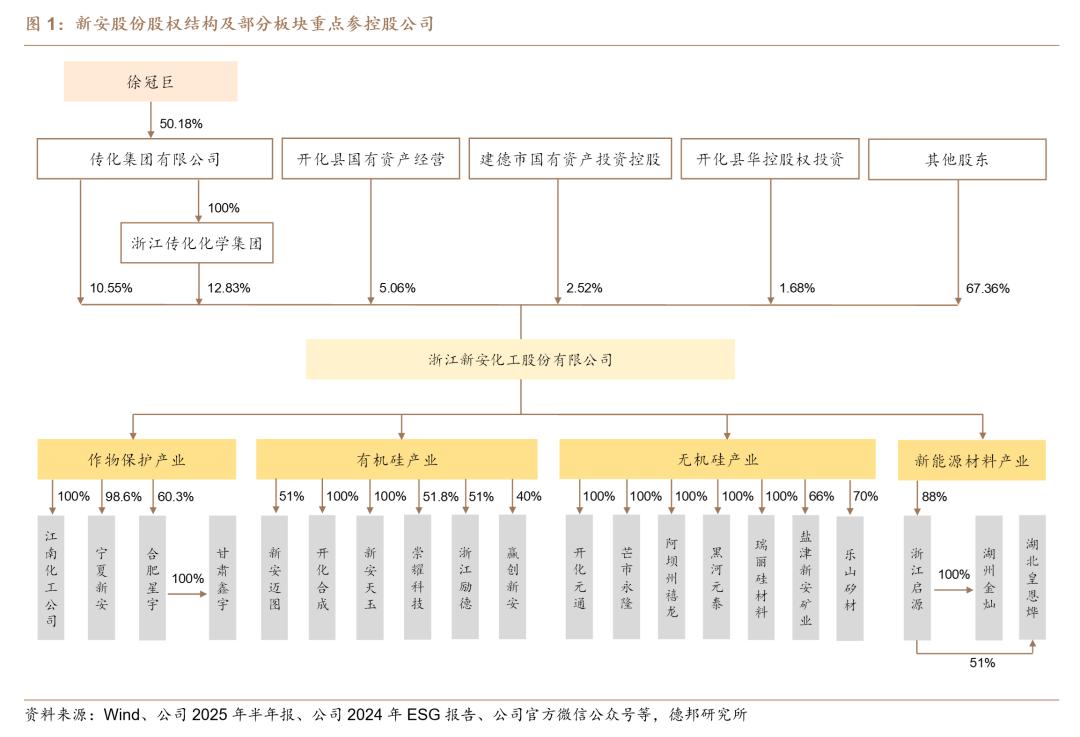 公司股权结构较为分散,实控人为传化集团董事长徐冠巨。截至2025H1,传化集团董事长徐冠巨先生通过传化集团及其全资子公司浙江传化化学,合计穿透持有新安股份11.73%的股份,为公司实控人。公司股权结构较为分散,其他主要股东包括开化县国有资产经营、建德市国有资产投资控股、开化县华控股权投资等多家国资背景单位。公司拥有控股子公司80余家,业务开展广泛,如有机硅相关的新安天玉(硅橡胶)、崇耀科技(硅油)、浙江励德(光伏粘接胶、电子灌封胶)、作物保护相关的镇江江南化工公司、合肥星宇、宁夏新安、新安阳光、造纸和塑料助剂龙头华洋化工等。