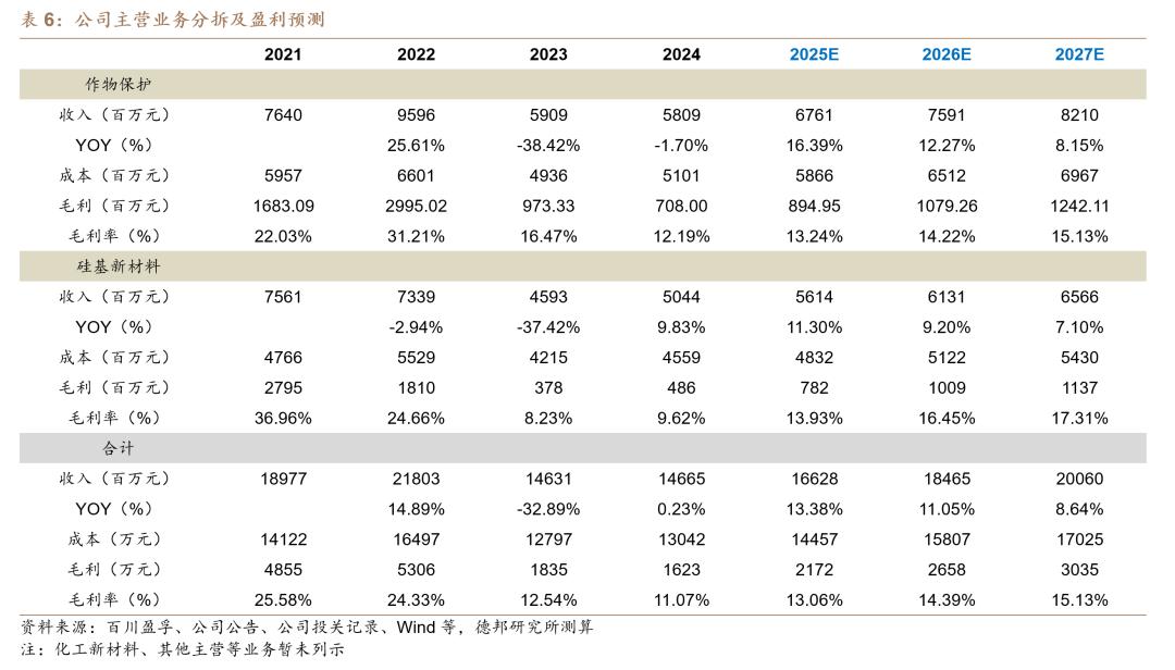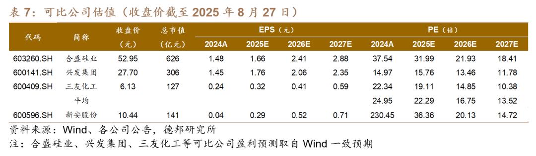 伴随公司海外业务加速突破、草甘膦与有机硅“反内卷”背景下的格局显著改善预期,以及公司在有机硅新应用领域不断探索边界,我们预计2025-2027年公司归母净利润分别为3.88、7.00、9.57亿元,同比+653.9%、+80.6%、+36.7%,对应EPS分别为0.29、0.52、0.71元。我们选取合盛硅业、兴发集团、三友化工作为可比公司,以2025年8月27日收盘价计算,2025-2027年可比公司PE均值分别为22.29/16.75/13.52倍,公司PE分别为36.36/20.13/14.72倍,考虑到公司硅基新材料主业深耕更高价值量的终端产品,通过灵活调整终端各系列产品生产节奏,提升中高端产品比重,不断优化终端产品盈利能力,我们认为给予一定的估值溢价合理。