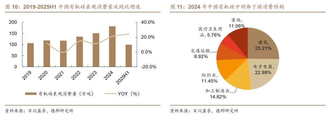 国内消费量稳定增长,传统领域比重仍较大。2024年全年,我国有机硅中间体表观消费量181.6万吨,同比+20.9%,增速整体稳中有升;2019-2024年,我国有机硅表观消费量年复合增速达11.3%;2025年前6个月,有机硅中间体表观消费量99.65万吨,同比再+23.9%,增速再度提升。从结构上看,据百川盈孚,2024年有机硅下游消费依然以建筑(25.2%)、加工制造业(14.6%)、纺织业(11.5%)等传统领域为主。近两年来,有机硅最大下游领域房地产受新开工面积大幅下滑影响,相关需求或一定程度削减,但伴随电子电器、交通运输等领域需求崛起,未来下游需求结构比重有望重塑。