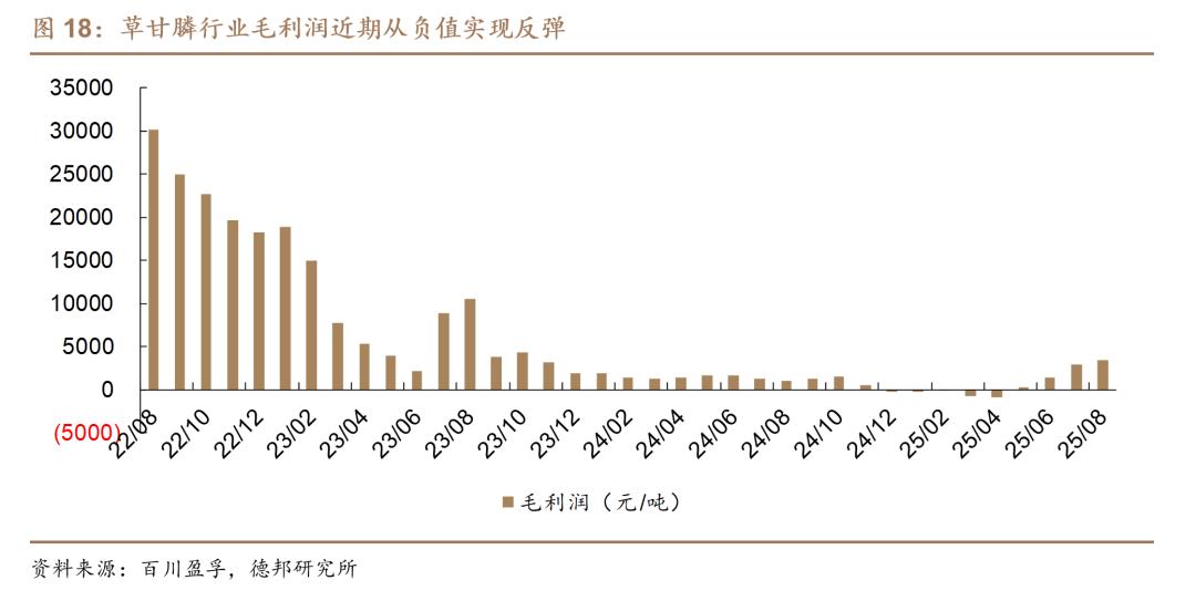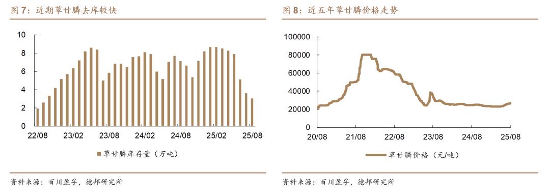 库存去化较为充分,价格回暖趋势确立。随着海外出口持续旺盛以及国内夏季农田除草需求的上升,下游制剂厂商备货积极性也逐步提升,草甘膦国内库存已至近三年较低位置,据百川盈孚,截至2025年8月22日,草甘膦行业库存仅为2.78万吨,环比-2.46%,同比-60.34%,较年内高点(8.69万吨)去化68.01%,去库或已较为充分,供需矛盾显著缓解,补库行情或蓄势待发。价格端看,截至8月22日,草甘膦价格回升至2.69万元/吨,较年内底部+17.42%,价格回暖趋势逐步确立。拉长周期看,当前价格距离2021年末时的历史最高报价8.03万元/吨仍有约2倍上涨空间。