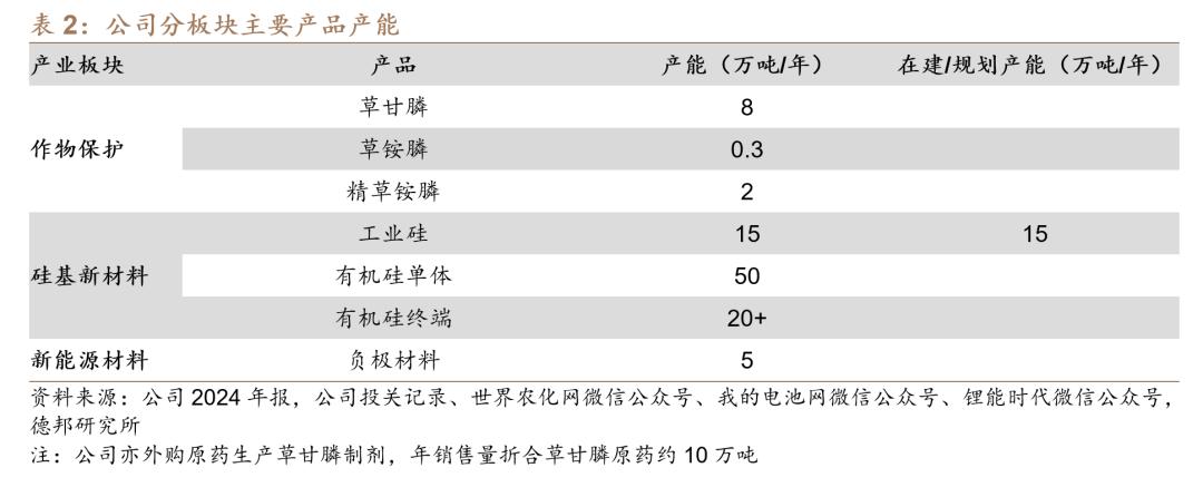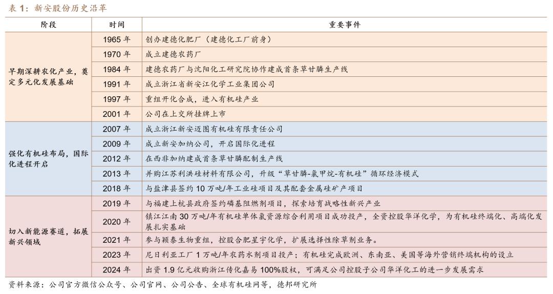 草甘膦有机硅双龙头,新能源材料蓄势待发。新安股份成立于1965年,核心业务覆盖作物保护、硅基新材料及新能源材料三大产业。其中,作物保护业务形成了“中间体-原药-制剂”的全链条一体化发展模式,涵盖种子种苗、除草剂、杀虫剂、杀菌剂、作物营养等完整的作物保护体系。硅基新材料产业拥有从上游硅矿开采冶炼、有机硅单体合成、下游产品制造的完整产业链,产品广泛应用于电力通信、轨道交通与汽车、医疗健康、消费电子等领域。新能源材料聚焦石墨负极、硅基负极、新型负极三大主要方向,提供动力电池、储能电池、3C消费电池等新能源应用场景负极材料综合解决方案,加快推动产业由草甘膦和有机硅的“双轮驱动”向“三足鼎立”转变。公司主业中“氯硅磷”三大元素循环的根本技术逻辑贯穿始终,相互支撑、相互赋能,助力公司发挥更大价值。