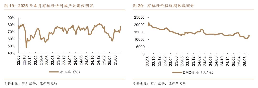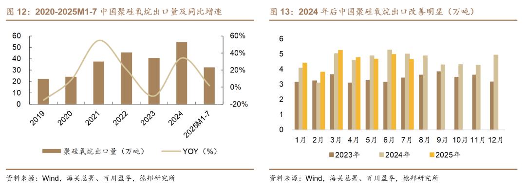 海外市场需求回升,有机硅出口失速逆转。中国是世界最大的有机硅原材料净出口国,2024年以来,中国有机硅出口表现同比大幅改善,2024年全年我国聚硅氧烷累计出口54.6万吨,同比+34.2%,较2023年全年-10.3%的同比增速有显著改善。2025年前7个月我国聚硅氧烷累计出口32.51万吨,同比+1.90%,在2025年上半年全球贸易争端的背景下仍维系正增长,或反映海外有机硅需求较为旺盛,2023年国外经济发展增速放缓叠加货币政策收紧导致有机硅消费收缩的态势已实现逆转。