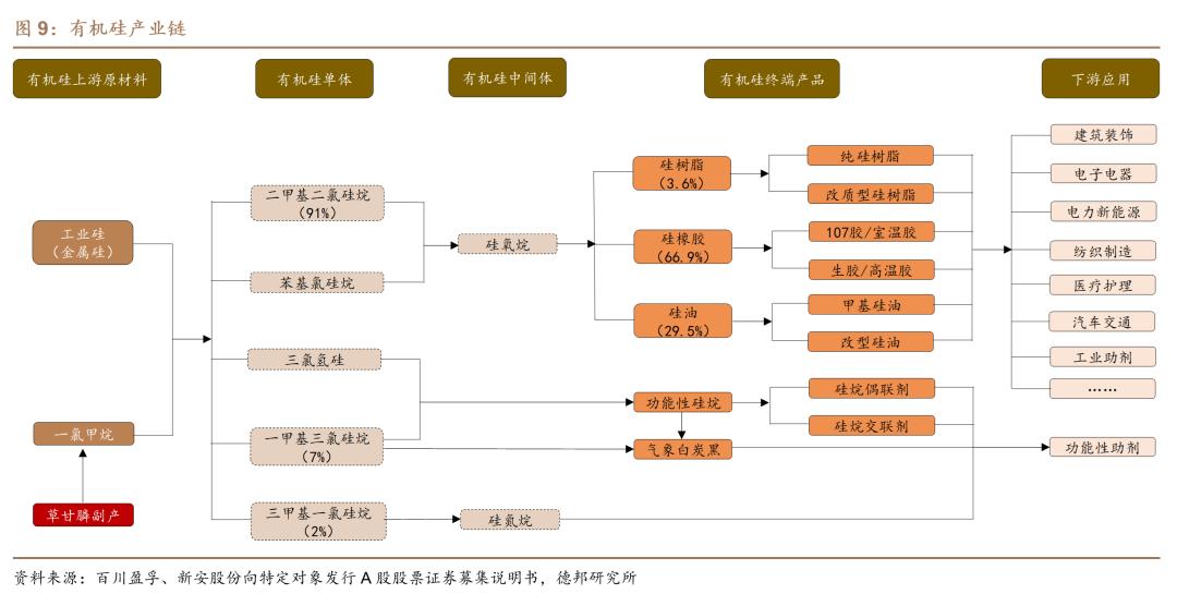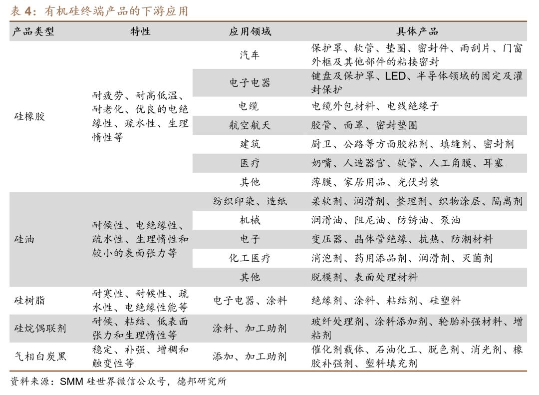有机硅终端产品性能优良,硅橡胶与硅油为最主流应用。有机硅单体经聚合、深加工改性后可生成各类有机硅终端产品,主要包括硅橡胶、硅油、硅树脂、硅烷偶联剂和气相白炭黑等。硅橡胶由于其耐疲劳、耐高低温、优良的电绝缘性广泛应用于电子电器、建筑建材、航空航天、化工医疗、光伏等多个领域,据百川盈孚,其在终端产品消费量中占比超60%;硅油具有卓越的耐热性、电绝缘性、耐候性、疏水性、生理惰性和较小的表面张力,广泛用作绝缘、润滑、防震油以及日用化妆品的消泡剂和纺织用处理剂,据百川盈孚,其在终端产品消费量中占比近30%;硅树脂具有突出的耐候性,强紫外线照射下也耐泛黄;硅烷偶联剂因为其耐水、耐候等性能主要用作密封剂、粘接剂和涂料的增粘剂;气相白炭黑在材料中表现出卓越的补强、增稠、绝缘性质被广泛用于添加剂、脱色剂、橡胶补强剂。