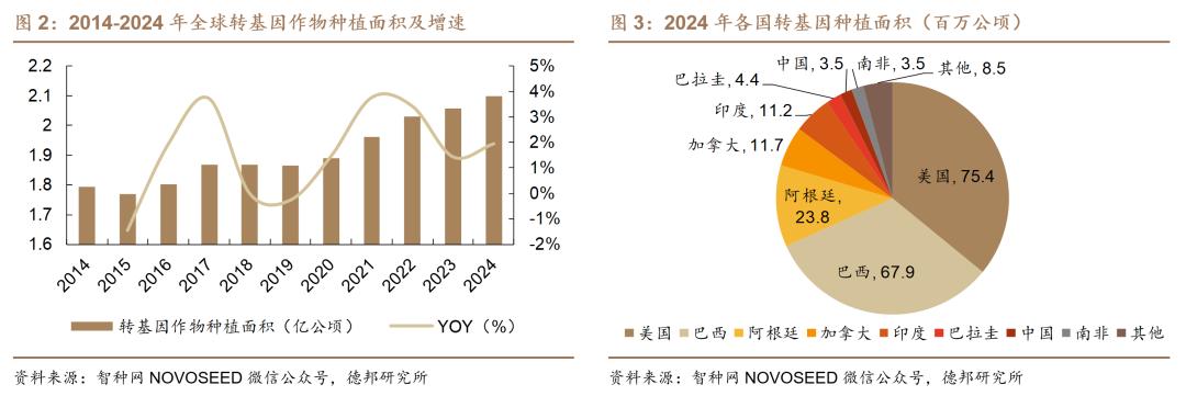 转基因作物刚需草甘膦,推广进度是需求关键变量。草甘膦的工作原理为抑制植物氮代谢酶(EPSPS合酶)的活性,从而让植物死亡。而通过基因改造可以生产抗草甘膦的转基因作物,转入的基因可以让氮代谢酶增加50倍,从而抵消草甘膦的作用,使之能够杀死杂草而不杀死庄稼。随着上世纪90年代开始转基因抗草甘膦作物(大豆、棉花、油菜、玉米)的发展,草甘膦的用量逐年增加。据智种网数据,2014-2024年,世界转基因作物种植面积从1.79亿公顷增长至2.10亿公顷,CAGR为1.58%,进一步巩固了草甘膦需求刚性。