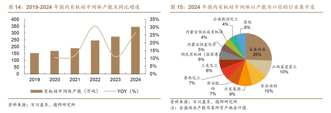 有机硅产能集中度提升,行业竞争格局有望转好。受益于前期下游需求快速增长以及较高利润吸引,中国有机硅产能经历了快速扩张周期,据百川盈孚,2019-2024我国有机硅中间体产能从151.5万吨加速增长至344.0万吨,年均复合增速为17.8%。当前中国已经成为世界最大的有机硅生产、消费和原材料净出口国,行业内主要生产企业包括合盛硅业、蓝星星火、东岳硅材、新安化工等,在资金、能源优势及一体化布局的影响下,行业产能不断向龙头企业集中,其中合盛硅业的有机硅产能占国内总产能比重超过25%,形成一超多强格局,2024年行业产能集中度CR4达54.65%,行业竞争格局有望趋于有序。