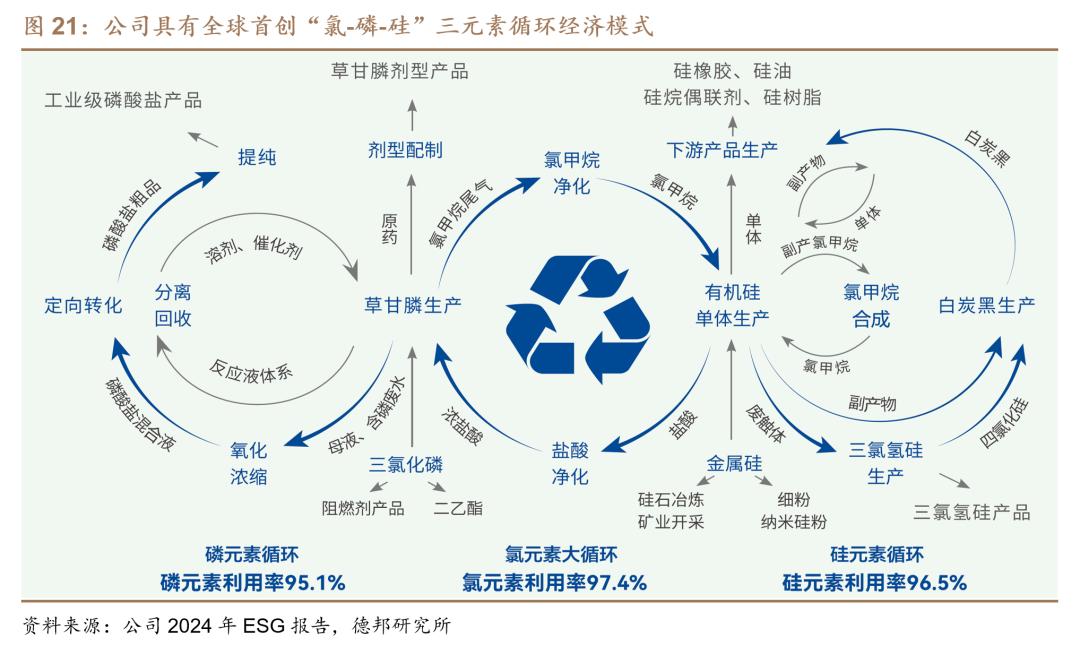 氯硅磷循环奠定成本优势,助力公司业绩向上。公司首次发现甘氨酸法草甘膦合成尾气中含有氯甲烷,自主研发了副产氯甲烷清洁回收技术,形成全球首创的“氯、磷、硅”三元素循环经济模式,业务协同性强。此模式下公司形成草甘膦与草铵膦协同生产、草甘膦与有机硅协同生产、含膦废液定向转化三条贯穿产业链的绿色连续化生产线,磷元素综合利用率提高28.7%,达98.3%;氯元素综合利用率提高20.4%,达97.4%;硅元素综合利用率提高11.6%,达96.5%,将传统化工的线性生产模式升级为“资源—生产—消费—再生”的闭环,我们认为此模式有望创造显著成本优势,夯实公司于周期底部率先复苏的基础。