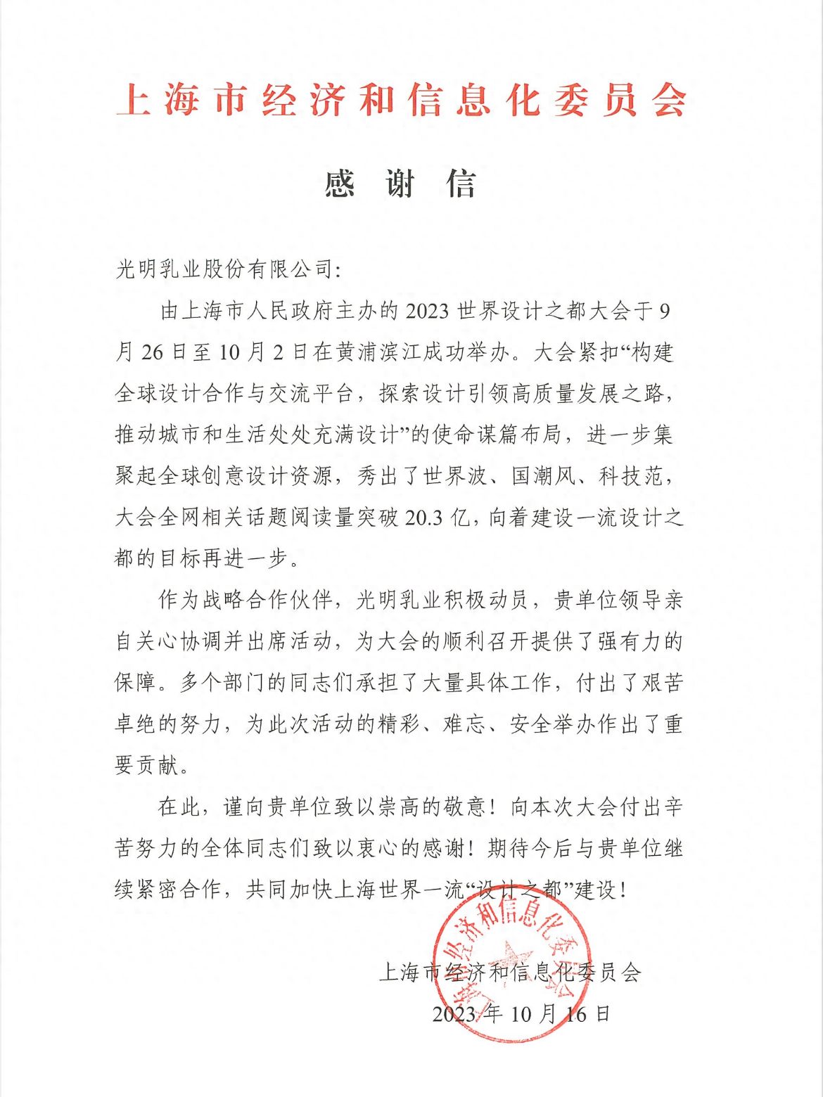 近日,由上海市人民政府主办的2023世界设计之都大会于9月26日至10月2日在黄浦滨江成功举办。作为大会的战略合作伙伴,上海市经济和信息化委员会向光明乳业送来感谢信,对光明乳业在大会举办期间的积极动员和支持保障给予肯定和感谢。在感谢信中,上海市经济和信息化委员会表示:光明乳业为大会的顺利召开提供了强有力的保障,为此次活动的精彩、难忘、安全举办作出了重要贡献。期待今后与光明乳业继续紧密合作,共同加快上海世界一流“设计之都”建设。