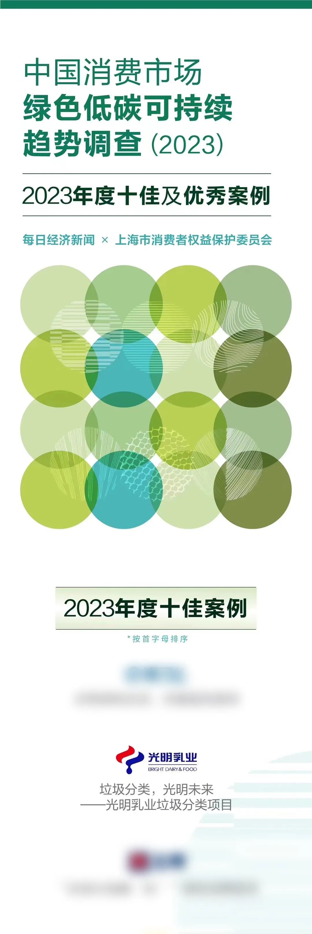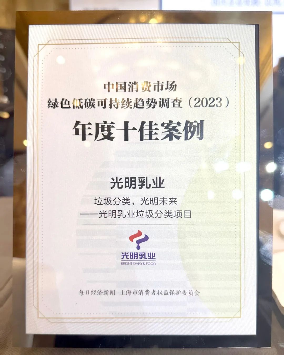 光明乳业凭借“垃圾分类,光明未来——光明乳业垃圾分类项目”在《中国消费市场绿色低碳可持续趋势调查报告(2023)》发布会上荣获“年度十佳案例”荣誉,并受邀参加之后的论坛,一起见证中国绿色低碳消费领域的阶段性成果。