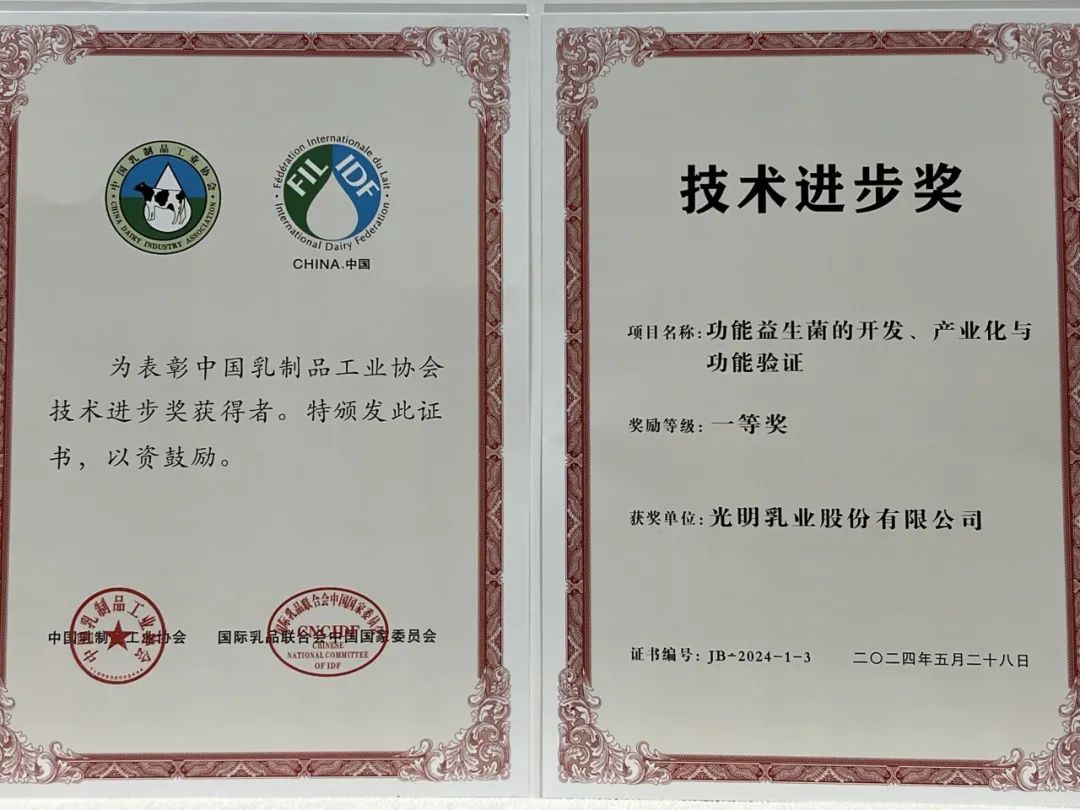 本次年会上揭晓并颁布了多项奖项榜单,光明乳业以创新为核打造新质生产力,荣获2024乳业科技创新企业奖项;凭借功能益生菌的开发、产业化与功能验证项目,获得技术进步奖一等奖;同时,光明乳业旗下婴幼儿配方乳粉获得2023年度主流品牌婴幼儿配方乳粉质量大赛质量金奖。