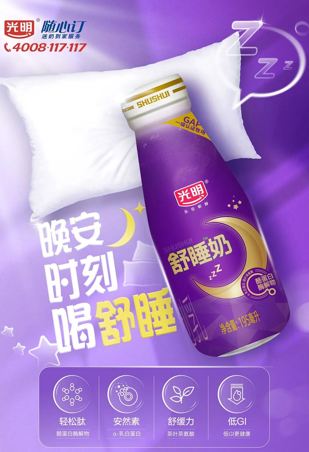 瞄准睡眠经济的光明舒睡牛奶严选GAP一级牧场奶源,添加γ-氨基丁酸(GABA)与茶氨酸;光明舒睡奶粉则融合光明自主专利菌株唾液链球菌嗜热亚种BD9818,并复配酸枣仁、茯苓等传统食材,双重赋能睡眠健康。
