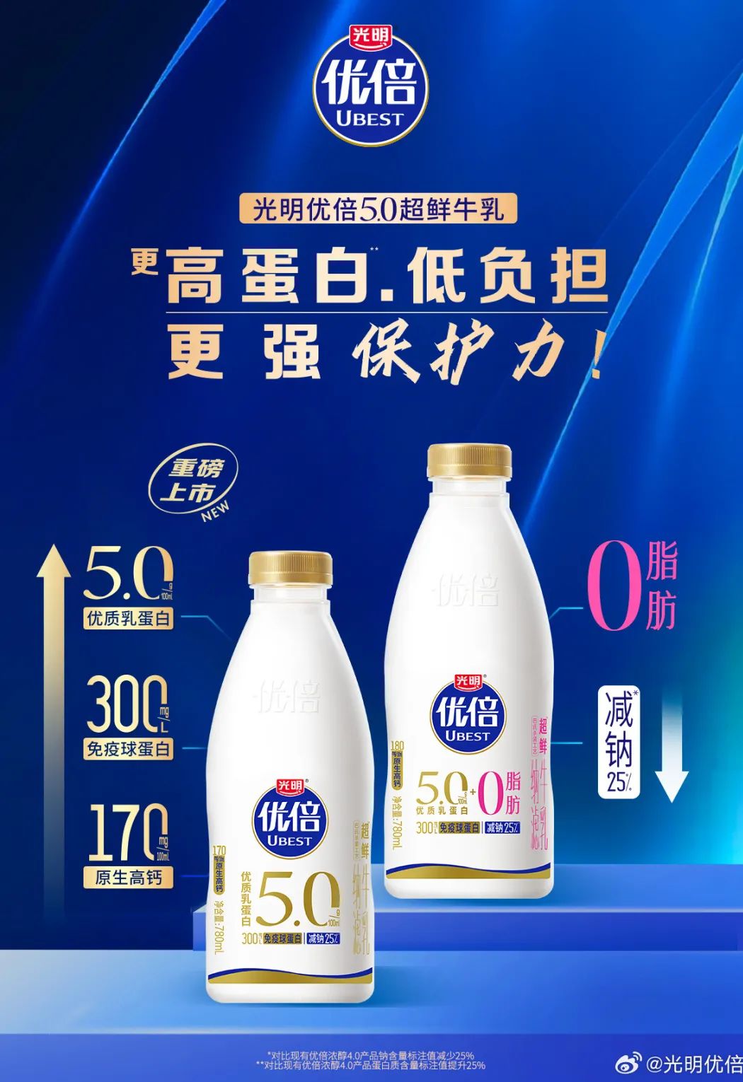 行业内首次使用纳滤浓缩与陶瓷微滤膜除菌组合工艺的光明优倍5.0超鲜牛乳,每100ml含5g优质乳蛋白,在保留更多优质营养的同时,为注重健康的都市人群提供轻负担选择。