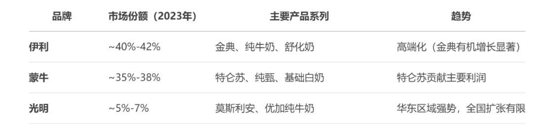 光明早期靠低温奶发展壮大,在巴氏奶领域有先发优势。但随着伊利、蒙牛引进的超高温瞬时灭菌技术和利乐无菌包装技术,成功突破物理距离限制,将“北奶”销往全国。2021年伊利、蒙牛在常温奶市场占据了高达67.6%的市场份额,光明乳业的市场份额约为12%。DEEPSEEK给出的最新市场份额数据如下图,结合三家近年的市场表现基本符合客观事实。