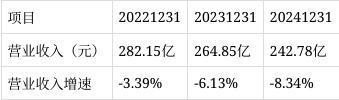 4月30日,A股披露年报的最后截止日,光明乳业2024年年报姗姗来迟,光明乳业的营收和净利润双双下滑。2024年光明乳业总营收242.78亿元,同比下降8.33%;实现归母净利润7.22亿元,同比下降25.36%;扣非净利润1.70亿元,同比下降幅度更大,达到67.48%。其中营收继2021年和2022年下滑3.39%和6.13%后,连续三年下滑,且下滑幅度呈递增趋势。