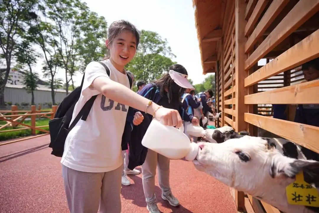 在犊牛饲喂区,同学们亲手为牛宝宝投喂初乳,感受饲养员的日常责任;与牧场守岗人对话时,那些与奶牛朝夕相处的故事,让劳动精神变得可触可感。