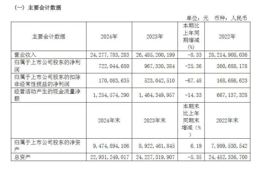 根据光明乳业发布的2024年度财务报告,2024全年该公司实现归属于母公司股东的净利润为7.22亿元,与上一年度相比大幅下滑了25.36%;同时,营业收入达到242.8亿元,却也同比下降了8.33%。