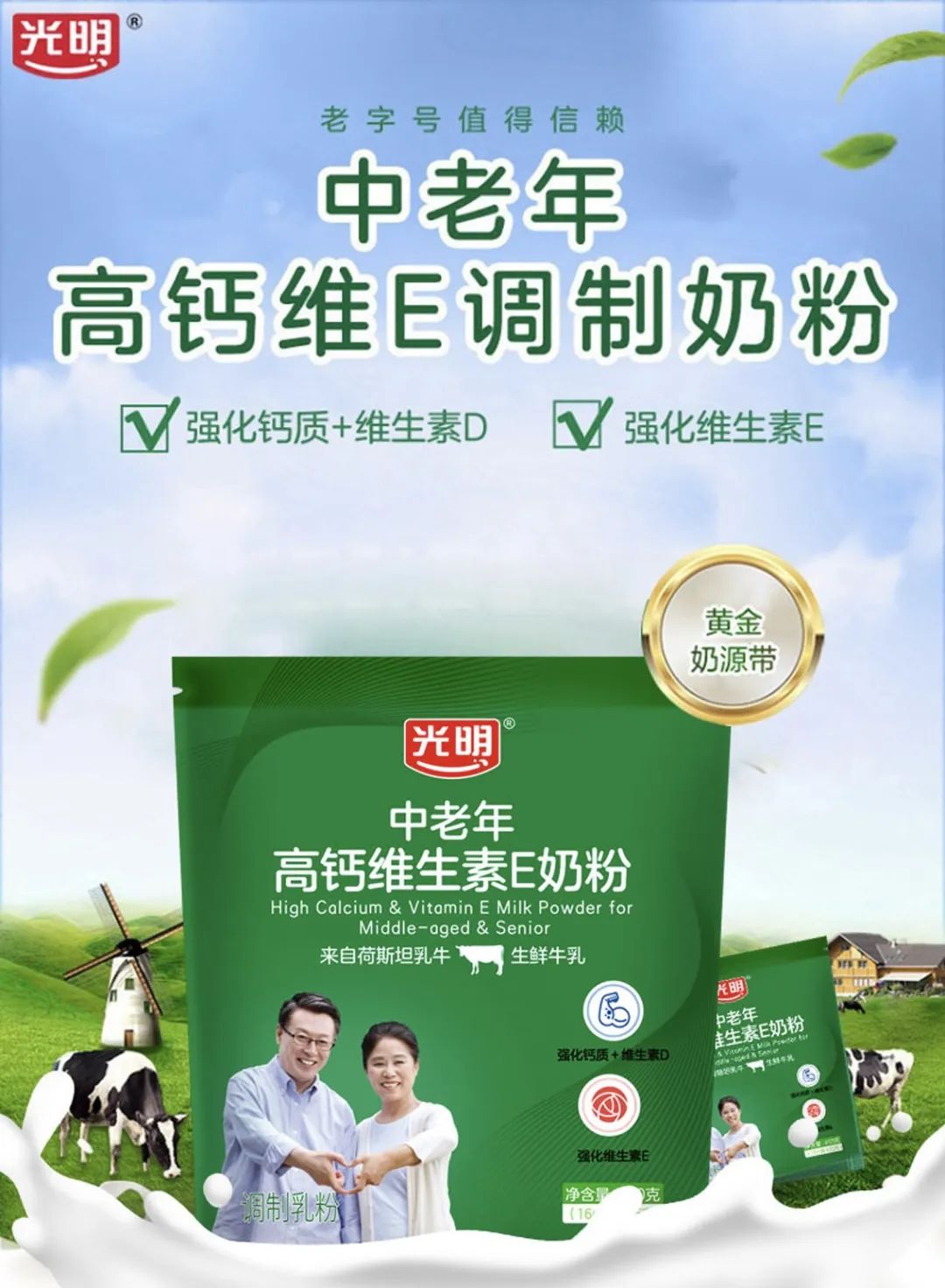 光明中老年高钙维生素E奶粉针对中老年群体特别研发,每100g奶粉中就含有1000mg钙和18g蛋白质,更添加维生素A、维生素D、维生素E组成的营养矩阵,提供抗氧化作用。同时含有天然水溶性膳食纤维——菊粉作为益生元成分,能高效促进钙与镁的吸收,守护银发人的肠道健康生态。