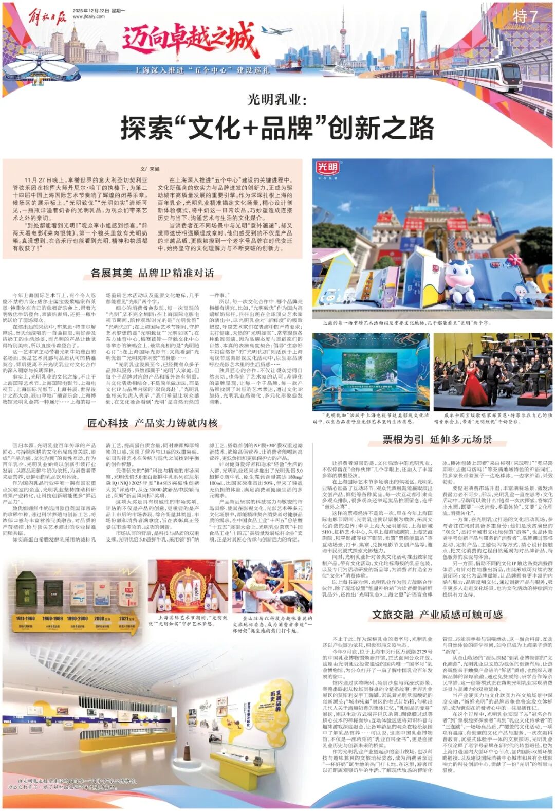 作为扎根上海的百年乳企,光明乳业精准锚定文化场景,设计创新体验模式,将牛奶巧妙塑造成连接历史与当下、沟通艺术与生活的文化媒介。不仅让百年品牌的形象愈发鲜活立体,也为上海提升城市软实力与建设国际消费中心城市贡献了独特的“光明能量”。近日,这一系列深耕“文化+品牌”的创新探索与显著成效,获得了《解放日报》的特别报道。
