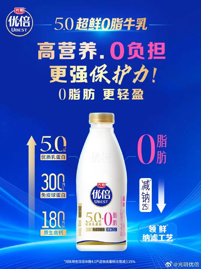 针对追求“轻盈”生活的人群,光明乳业同步推出了光明优倍5.0超鲜0脂牛乳,原生高钙含量高达180mg/100mL,比国家标准高出50%,带来了轻盈无负担的体验。