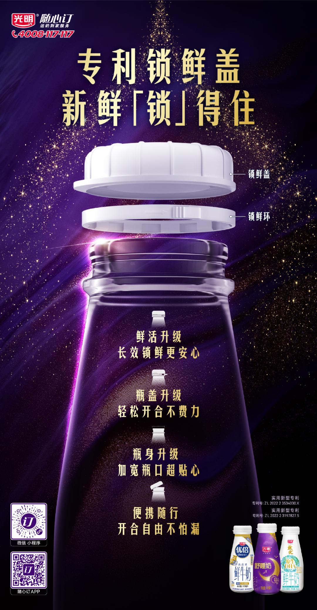 光明随心订玻璃瓶乳制品已实现全线升级,搭载光明专利锁鲜盖,精准阻隔空气与细菌侵入,既保证密封安全性,又做到轻松开合、便携不漏,让消费者享受新鲜、安全的乳品。