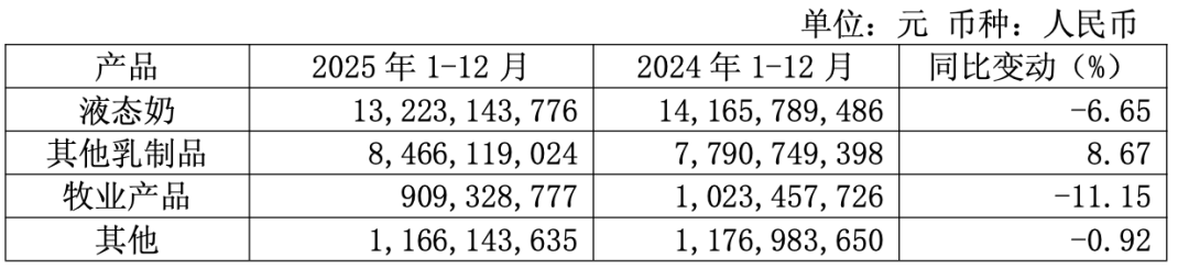 按产品种类划分,2025年公司液态奶实现营业收入132.23亿元,同比减少6.65%;其他乳制品实现营业收入84.66亿元,同比增加8.67%;牧业产品实现营业收入9.09亿元,同比减少11.15%;其他产品实现营业收入11.66亿元,同比减少0.92%。